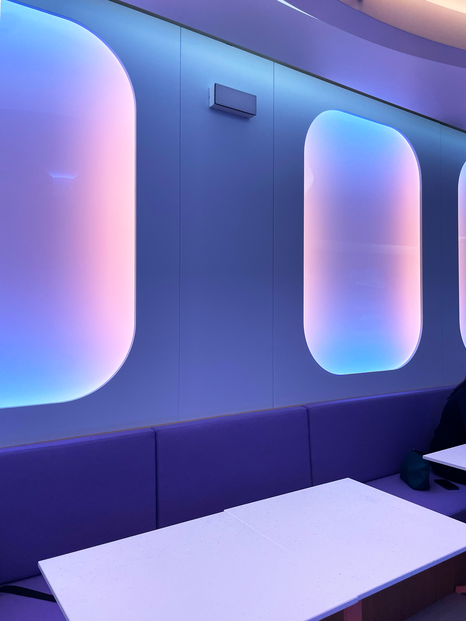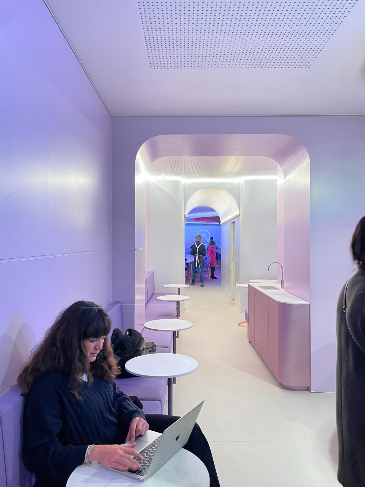 L'identité de la communauté Avalon s'incarne dans le choix singulier des couleurs et matières, dans une palette de roses, mauves et violets.