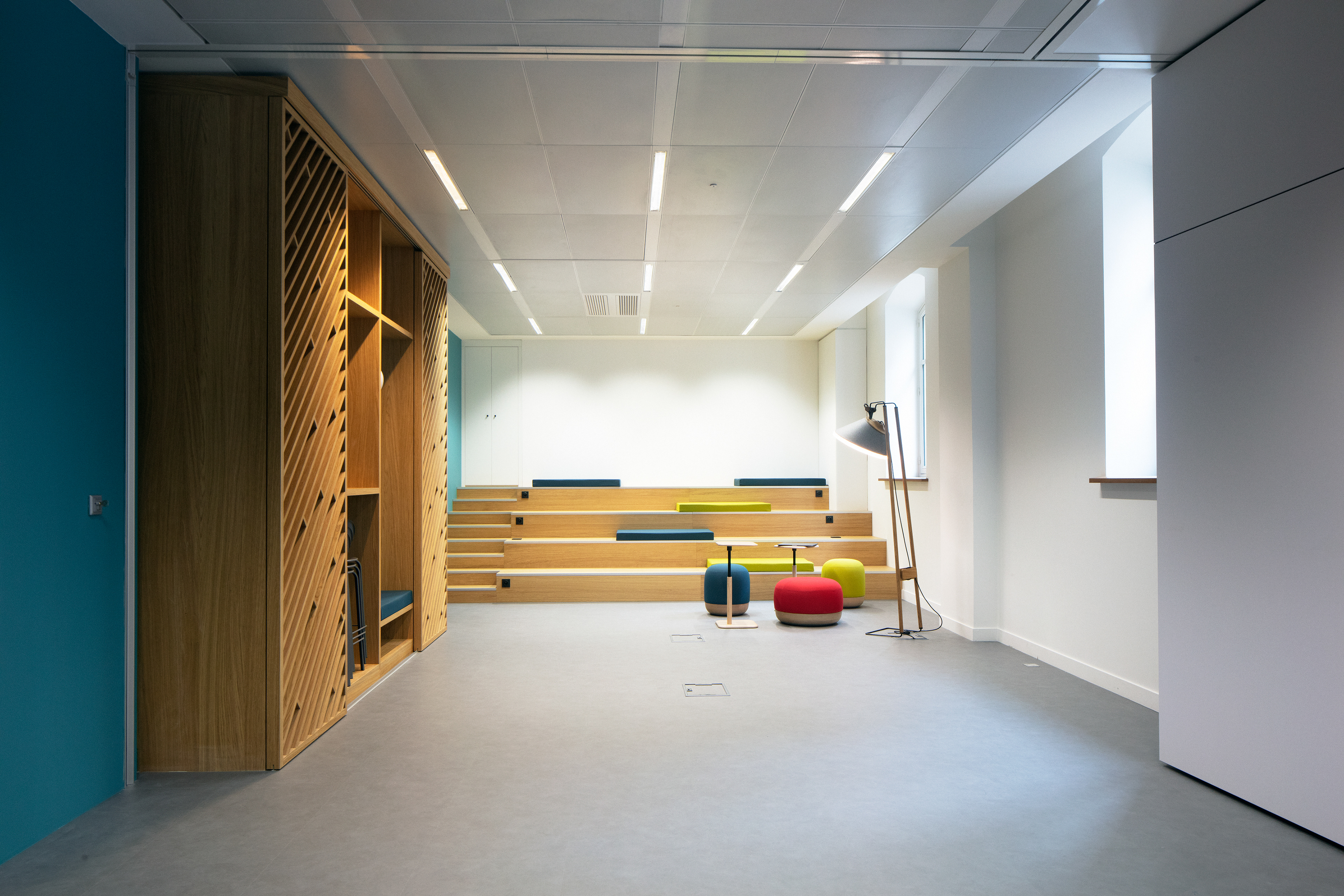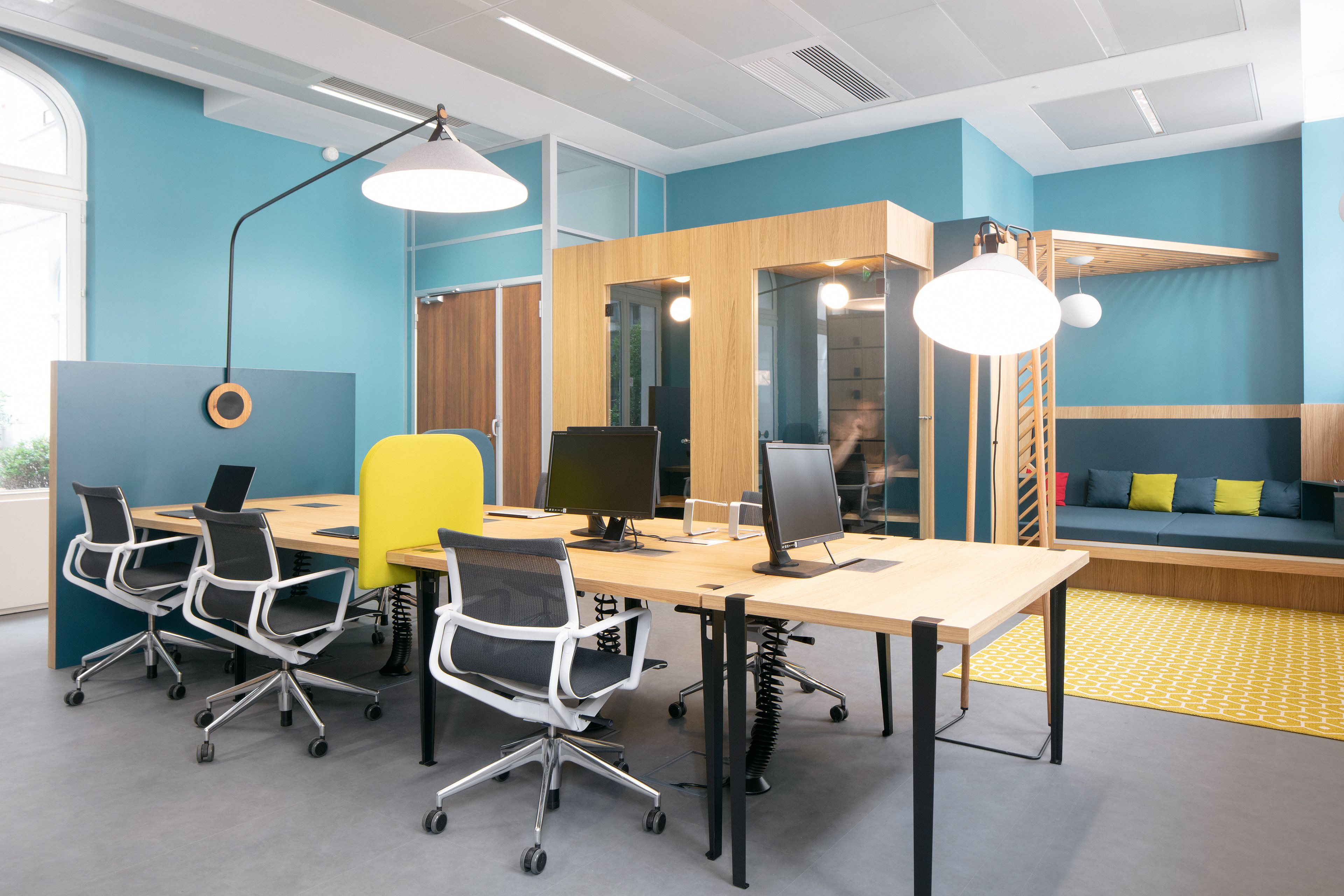 L'objectif consiste ici dans le réaménagement d'espaces de travail cloisonnés et d’espaces supports (reprographie, cafeteria) en un ensemble de lieux propices à l’innovation, la flexibilité et l’échange.